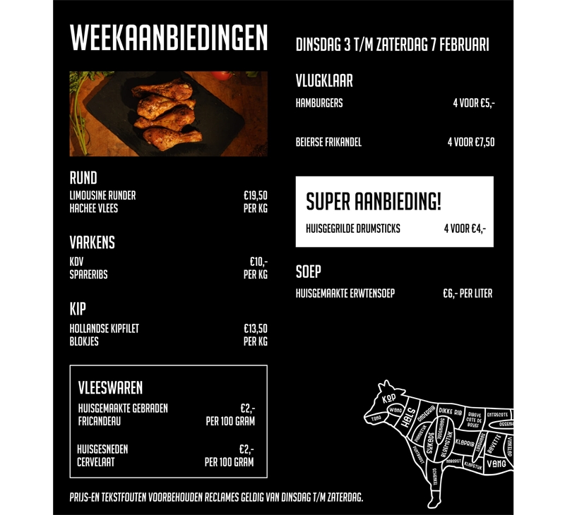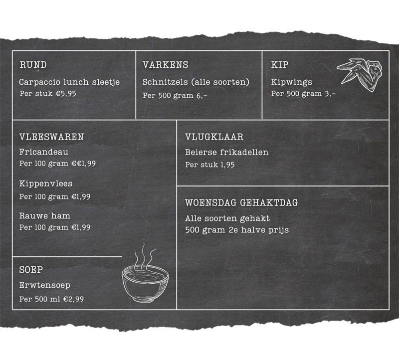 (Vader) Antoine en (zoon) Yannick zijn de ambachtelijke vakmannen die verstand hebben van lekker vlees. Authentieke vleeswaren en de beste producten om de lekkerste gerechten mee te maken. zoveel mogelijk verwerkt in onze eigen werkplaats.
